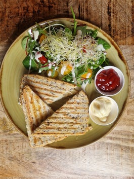 Steeds geserveerd met wat garnituur on the side (trio van sla, kerstomaatjes en preischeuten)